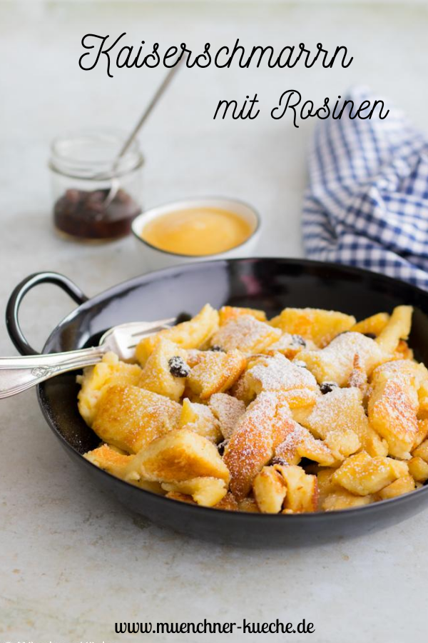 Ich backe den Kaiserschmarrn nicht im Ofen, sondern mache ihn nur in der Pfanne. Damit er dort luftiger wird, schlage ich das Eiweiß dafür extra auf und hebe es vorsichtig unter den restlichen Teig. Ich mag es, wenn er mit Rosinen serviert wird. Ich weiß aber, dass viele keine Rosinen mögen, daher kann man sie ganz problemlos auch weglassen. Am liebsten esse ich dazu Apfelmus. Der Kaiserschmarrn wird aber auch oft mit Zwetschgenröster serviert. Auch eine feine Variante.